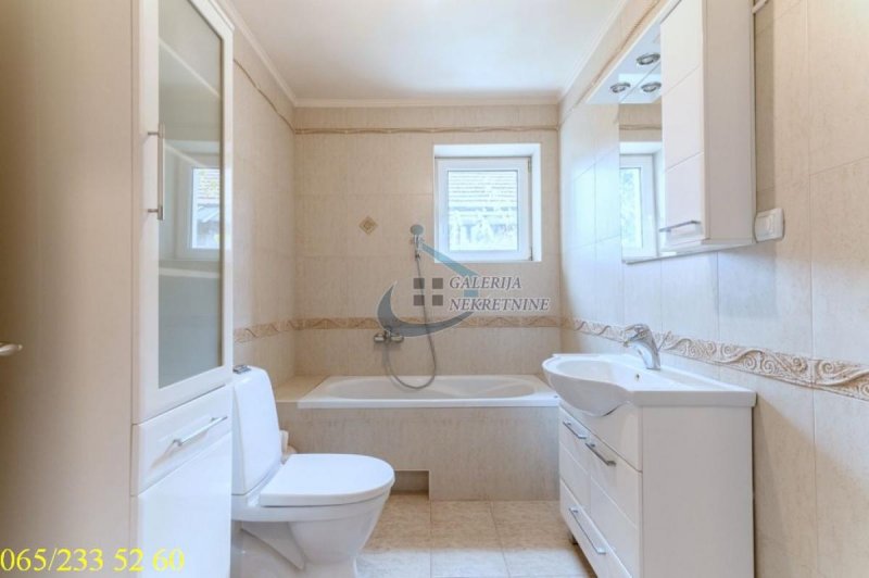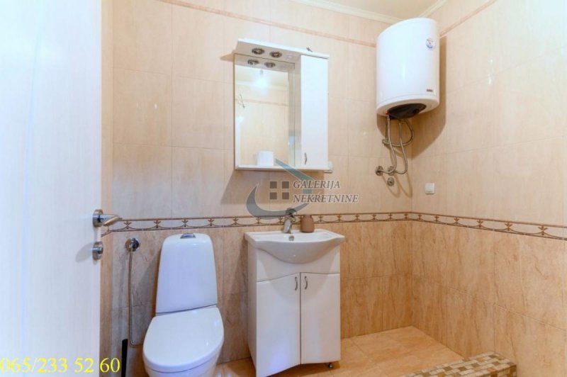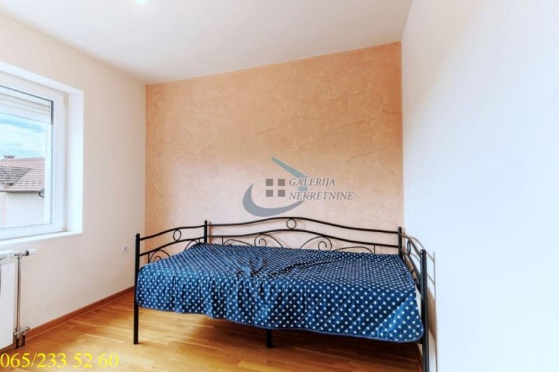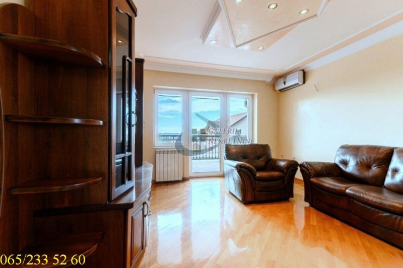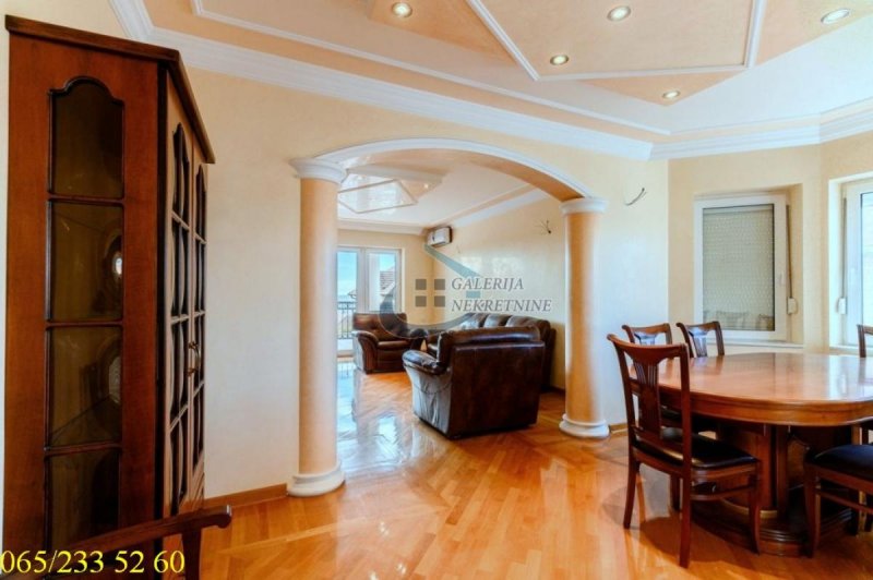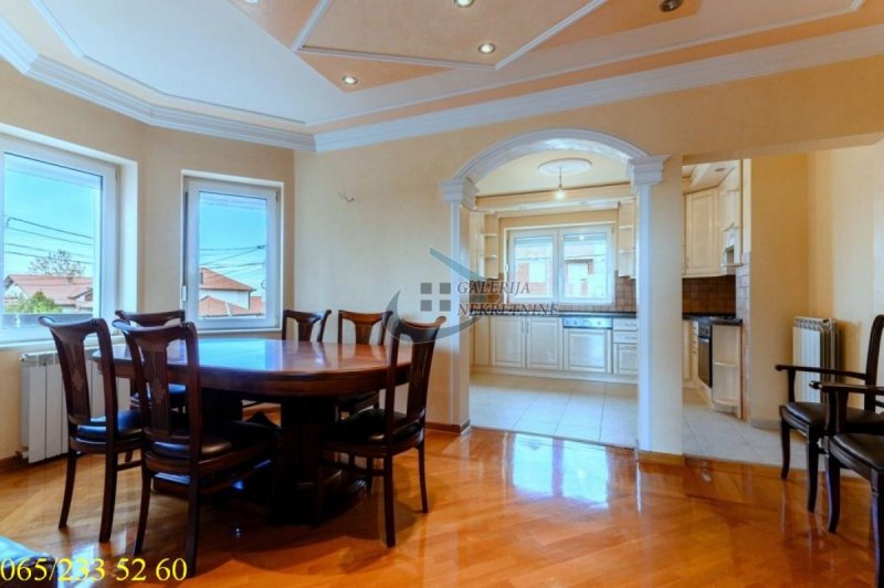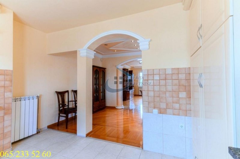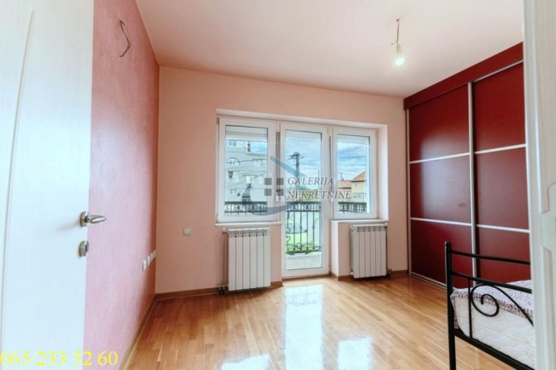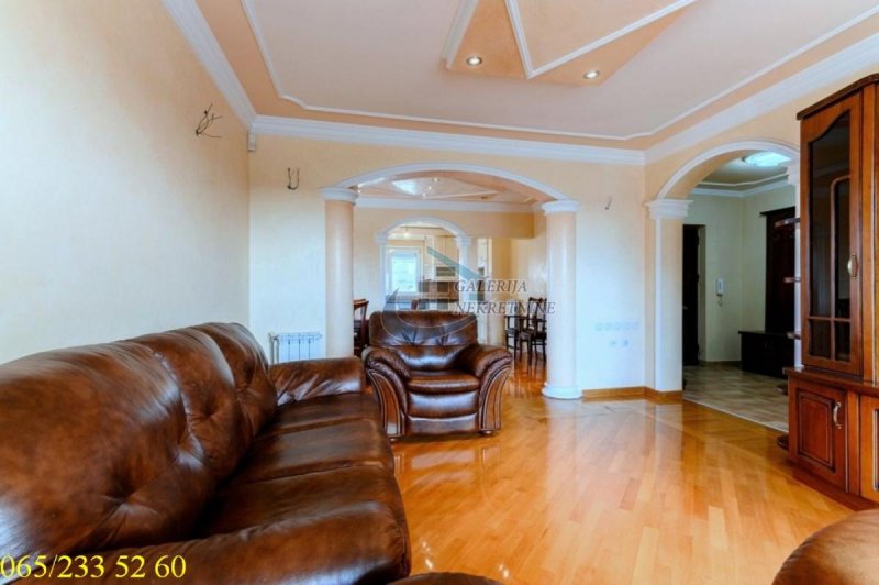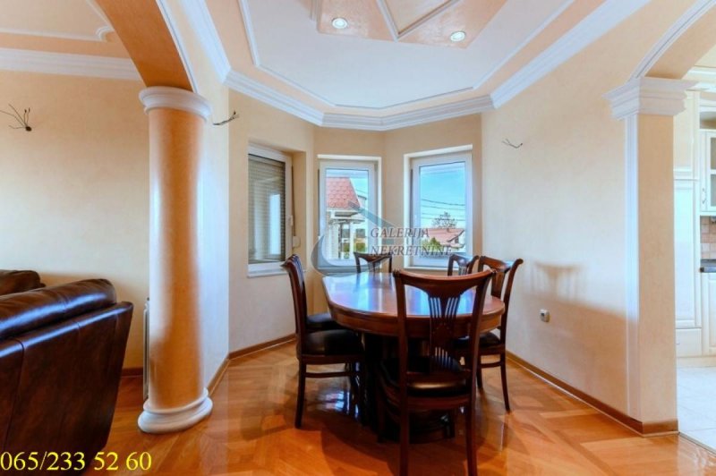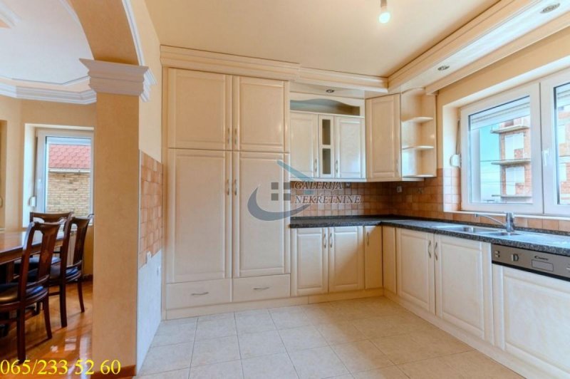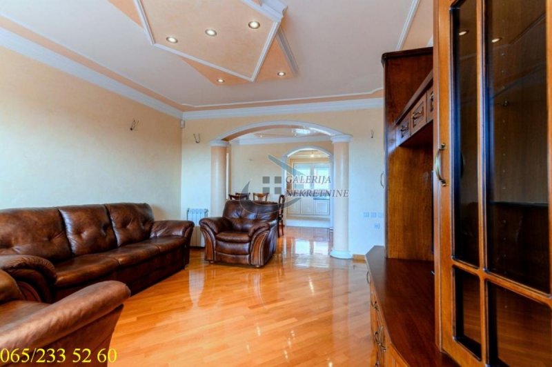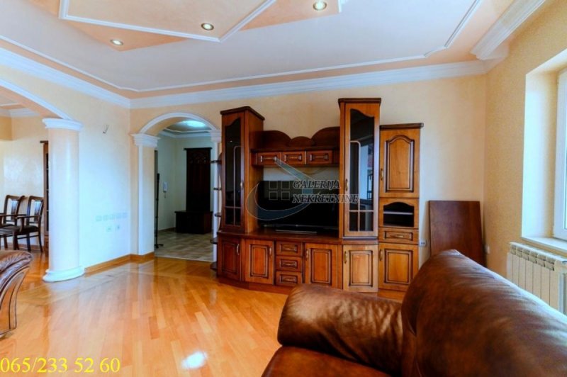 U prilici smo da Vam ponudimo četvorosoban stan, u novijoj zgradi na prvom spratu dvospratnice. Gradnja zgrade je rađena materijalima visoke klase, sendvič zid debljine 60cm, pikovana fasada, granitno stepenište sa prohromskim rukohvatima, kovano gvožđe na terasama, oko zgrade je rađen štampani beton. Dobro održavana i uredna nekretnina. Stan je cela etaža zgrade, ukupno ima pet stambenih jedinica. Koncepcija stana je da se sa jedne strane nalazi spavaći blok sa tri spavaće sobe i jednim kupatilom a sa druge celina dnevnog boravka trpezarije i kuhinje (kompletno opremljena). Iz dnevnog boravka se izlazi na terasu sa pogledom na dvorišnu stranu u kojem se nalazi bazen. Na dve spavaće sobe su terase. U dvorištu zgrade je bazen 5, 5x12, 5 metara dubine 1, 6 metara, deo za sedenje sa nadstrešnicom i prostoriom za tuš i saunu. Uz stan ide jedno parking mesto. Nekretnina za svaku preporuku i udoban život.
