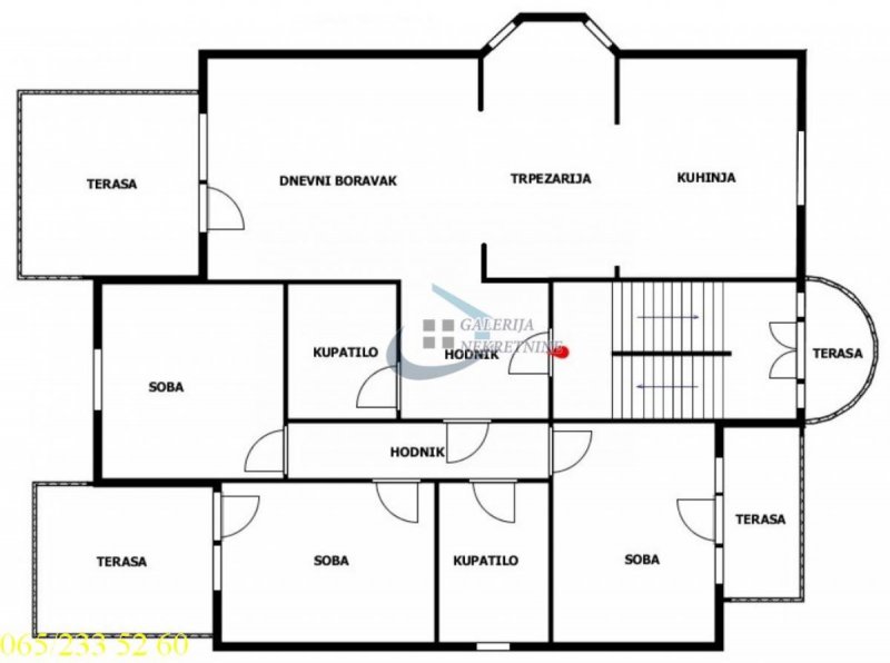 Od prostorija: Dnevno-trpezarijski deo, kuhinja, dva hodnika, tri spavaće sobe, dva kupatila, tri terase.