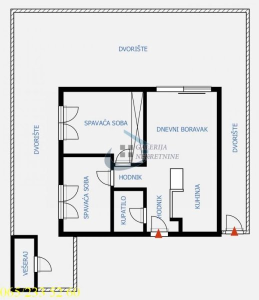 Od prostorija: Ulazni hodnik, dnevni boravak, kuhinja, kupatilo, hodnik, dve spavaće sobe i dvorište.