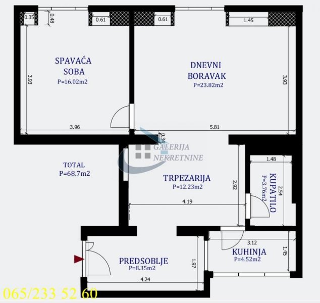 Od prostorija: prostrano ulazno predsoblje, kuhinja, prijemni salon/trpezarija, dnevni boravak, spavaća soba, kupatilo.