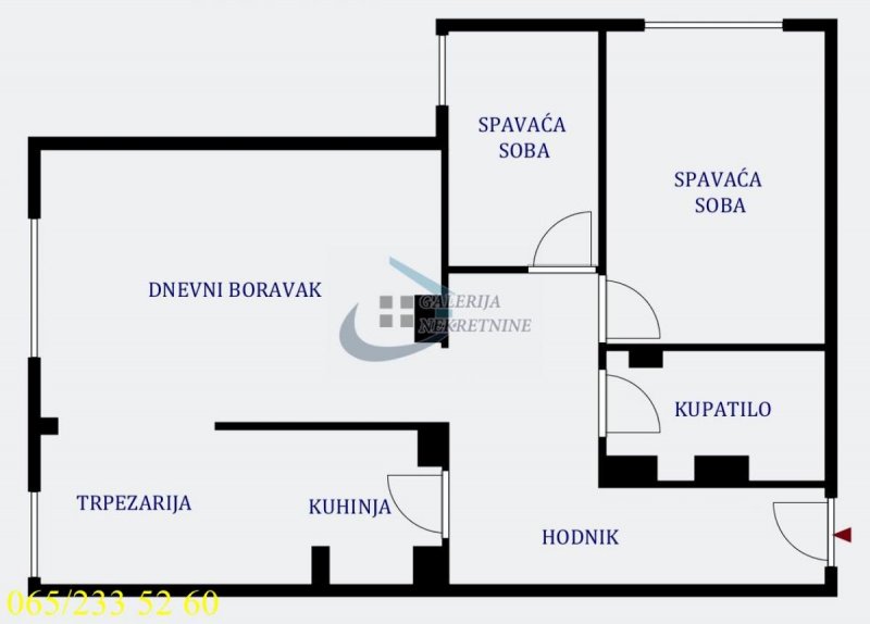 Prostorije: hodnik, predsoblje, kuhinja sa manjim trpezarijskim delom, dnevni boravak, dve spavaće sobe (veća i manja), kupatilo.