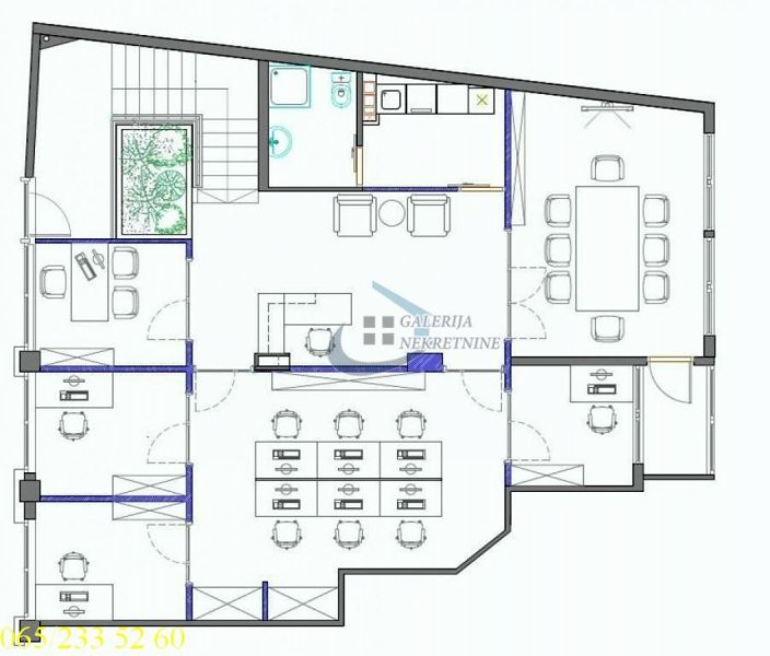 Od prostorija: prijemna prostorija sa portirnicom, četiri odvojene kancelarije, open space kancelarija, sobu za sastanke, kuhinja, kupatilo i lođa.