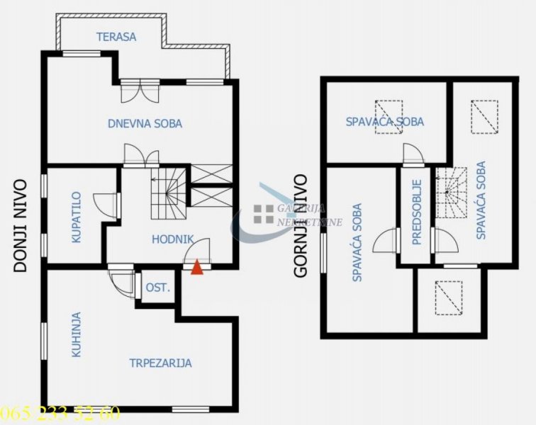 Donji nivo: hodnik, dnevna soba, terasa, kuhinja sa trpezarijom, ostava i kupatilo - trpezarijsko - kuhinjski deo, toalet, predsoblje, tri spavaće sobe, kupatilo, terasa