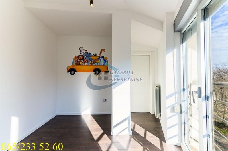 Stan je perfektno projektovan i organizovan do najsitnijih detalja kako bi se zadovoljile estetske i funkcionalne potrebe vlasnika. Sama po sebi, ova nepokretnost je odlično koncipirana, gde je apsolutno bačen akcenat na prostor i svetlost. Kvalitet gradnje, ugrađenih materijala i opreme je visok (spoljašnja stolarija, odlična unutrašnja stolarija, podovi su obloženi vrhunskim paketom, kvalitetna keramika, itd.... ). Trostrano orijentisan, izuzetno komforan, sa komotnim i funkcionalno raspoređenim prostorijama. Zbog velikih prozora je savršeno osvetljen i bez buke, otvorenog panoramskog pogleda na okolinu i Košutnjak. Prvi nivo sačinjava dnevno-trpezarijsko deo u modernom open space konceptu sa diskretno odvojenom i kompletno opremljenom kuhinjom, toalet, ostava/garderober i tri terase. Drugi nivo činjava open space prostor koji može koristiti kao dnevni boravak ili radni deo, dve terase, master spavaća soba sa walk-in garderoberom i izlazom na terasu, još dve spavaće sobe sa svojim garderoberima, veliko moderno mermerno kupatilo sa podnim grejanjem, ugaonom kadom, podnim tušem, duplim lavaboima, toaletom i bideom. Oba nivoa povezuje stepenište sa gazištima od tamno lakiranog punog drveta. Vrhunska estetska rasveta dodatno doprinosi osećaju luksuza i elegancije. Grejanje na gas (preko gasnog kotla), koji se nalazi u ostavi sa toaletom u dvorištu, omogućava maksimalnu samostalnost i racionalizaciju troškova. Naravno tu je i centralna klima i klima uređaji. Privatno uređeno dvorište koje pripada ovom stanu ima zidom obezbeđenu privatnost. Iz dvorišta se ulazi u veliku ostavu i dodatnu letnju kuhinju.