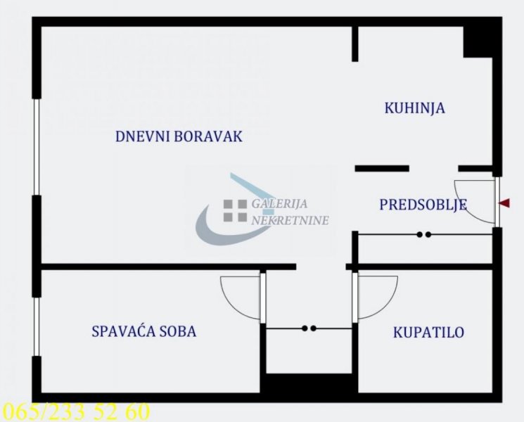 Od prostorija: ulazno predsoblje, kuhinja, dnevni boravak, hodnik, spavaća soba, kupatilo.