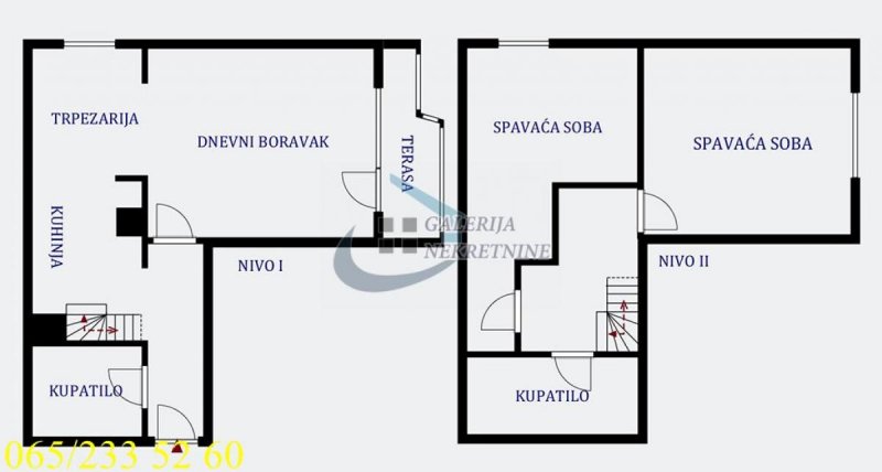 I nivo: hodnik, kuhinja, trpezarija, dnevni boravak, kupatilo, terasa.