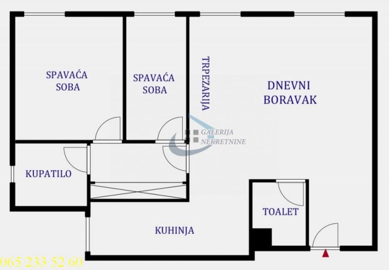 Od prostorija: dnevni boravak sa trpezarijom, kuhinja, hodnik, dve spavaće sobe, kupatilo, toalet.